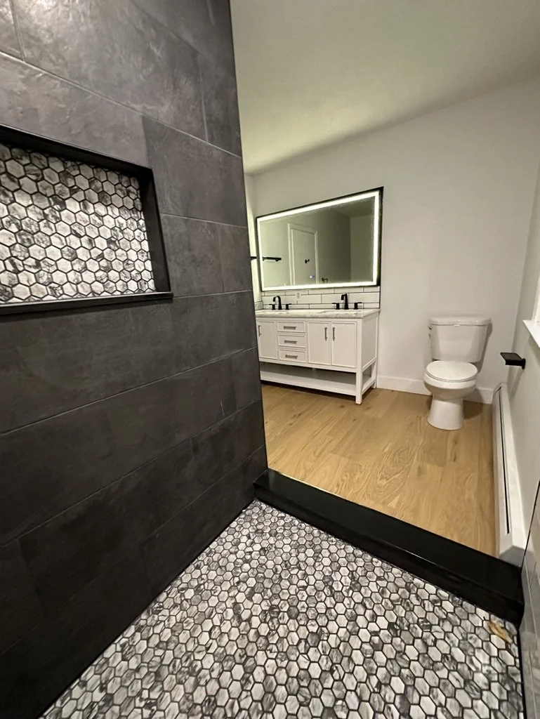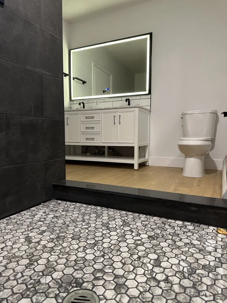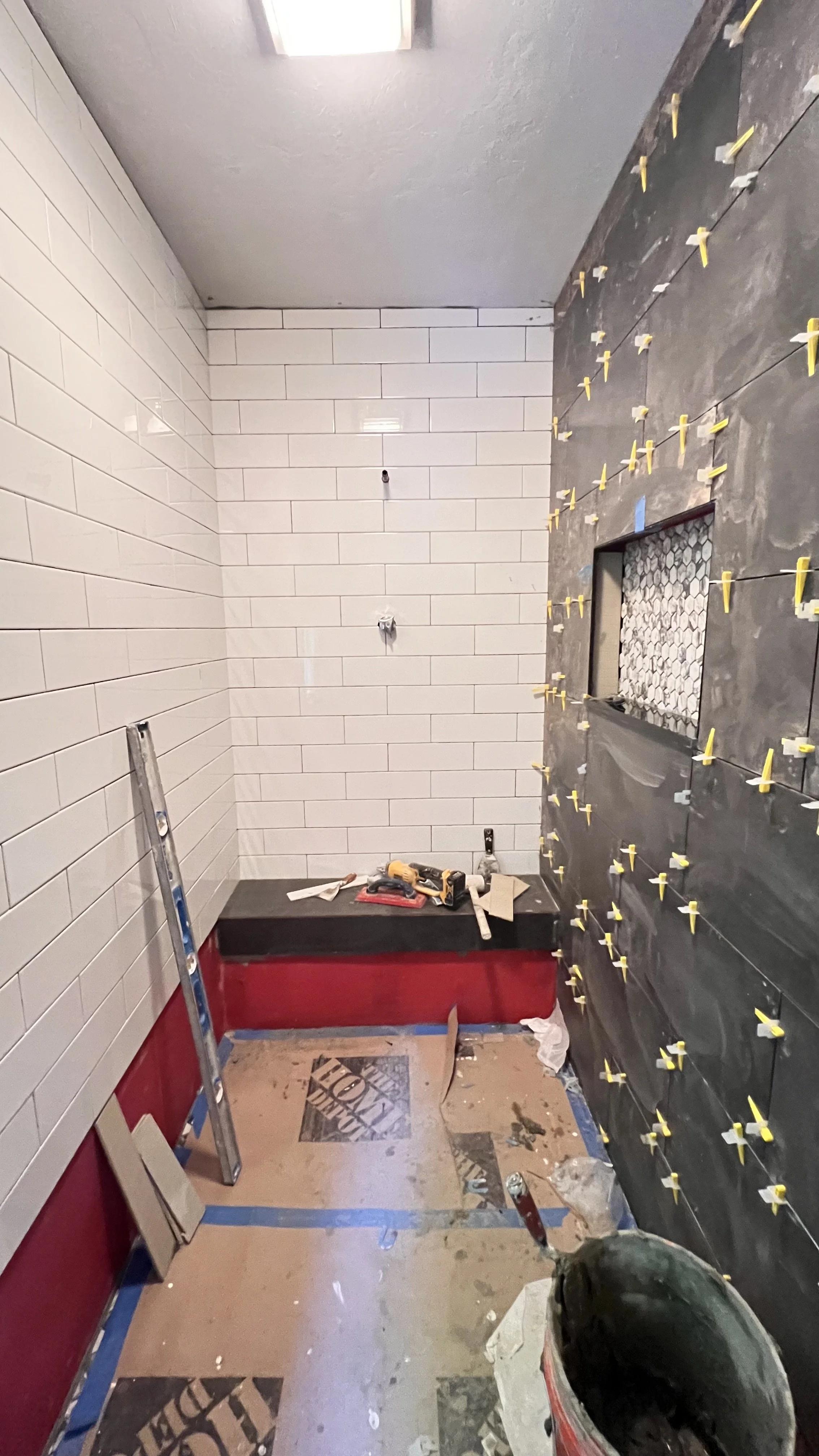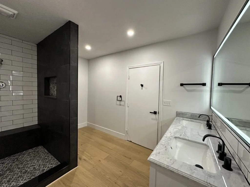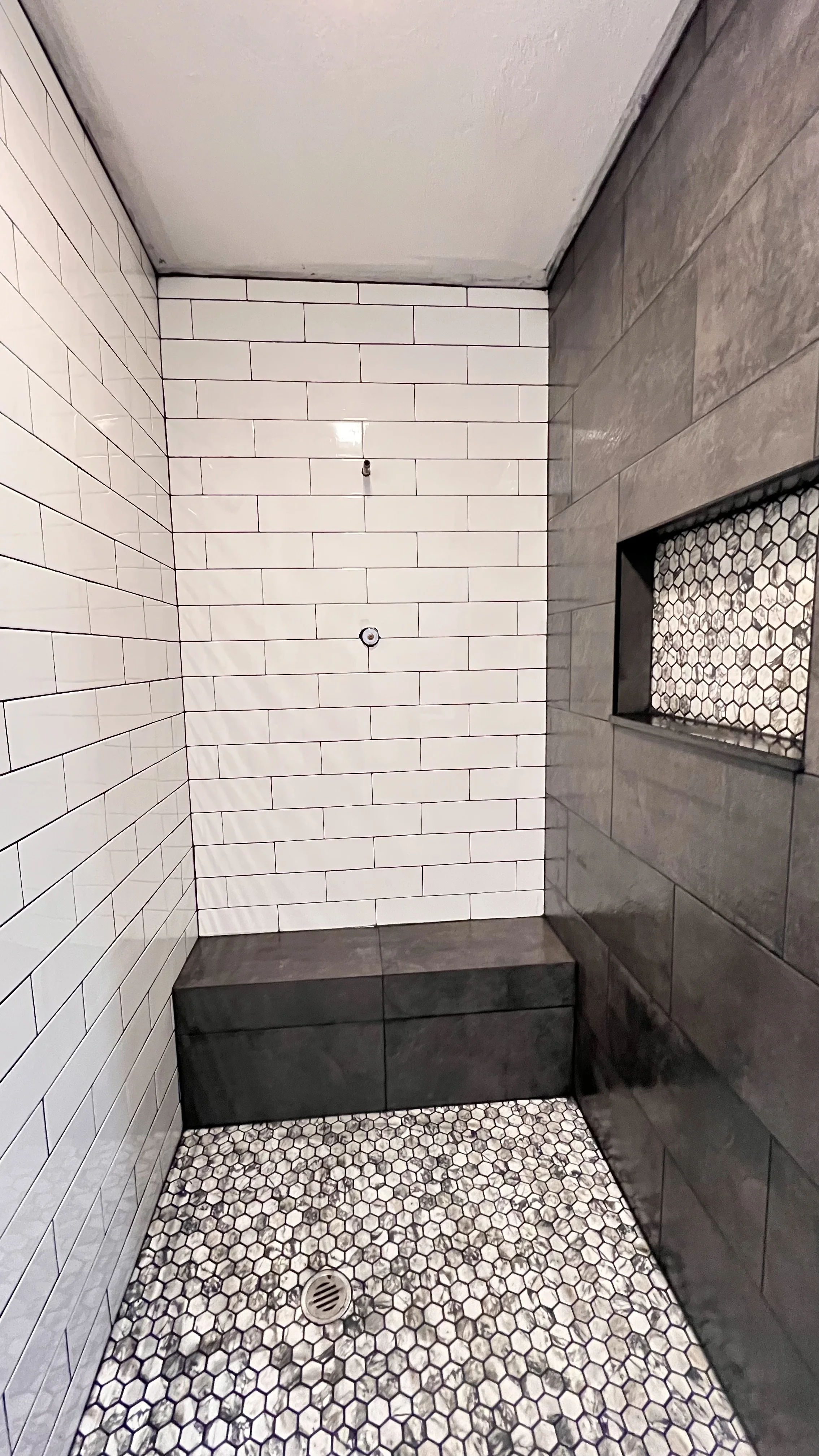 Elegant Modern Farmhouse bathroom design with white tile, black accents, and a sophisticated, balanced aesthetic.
