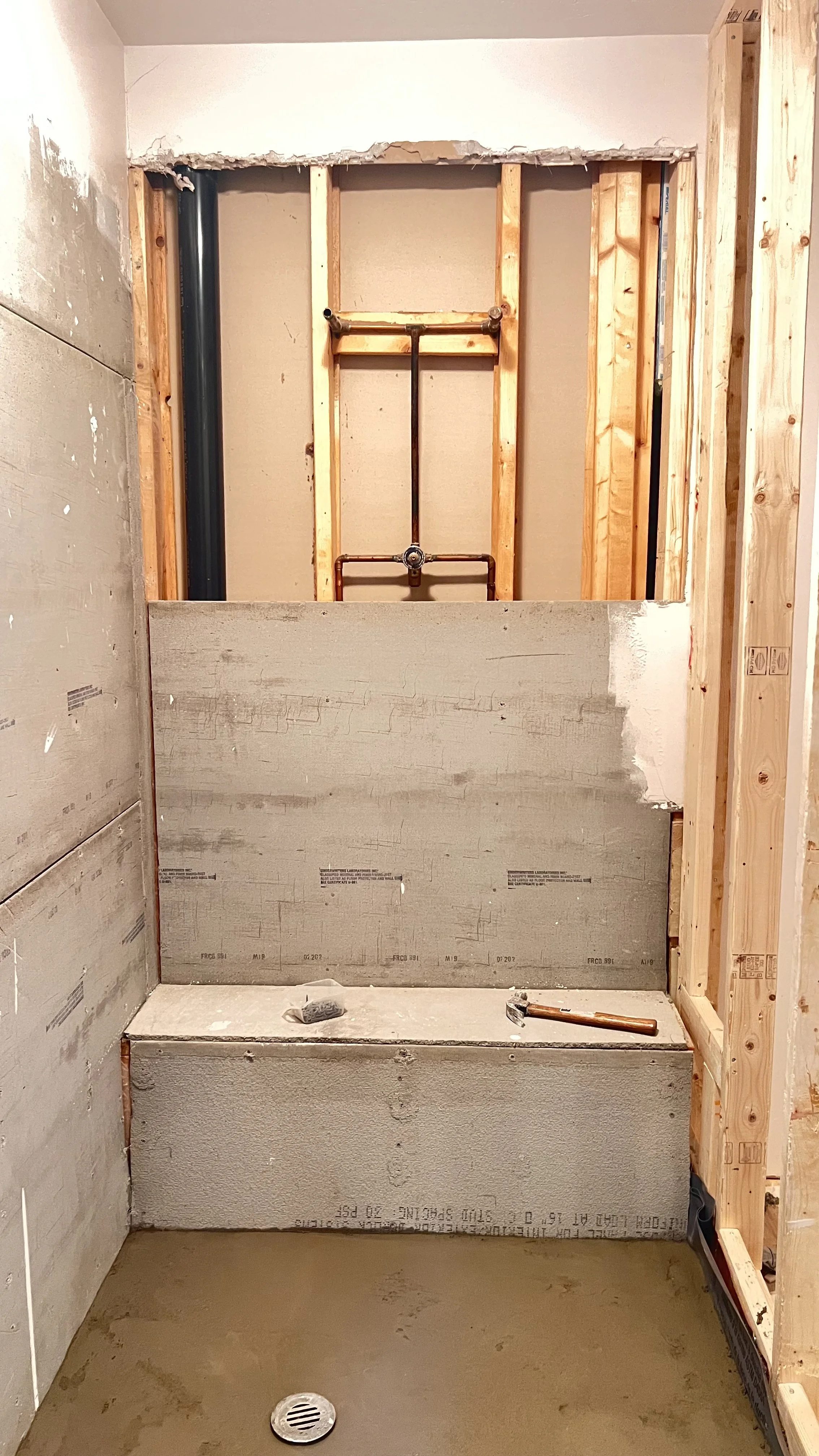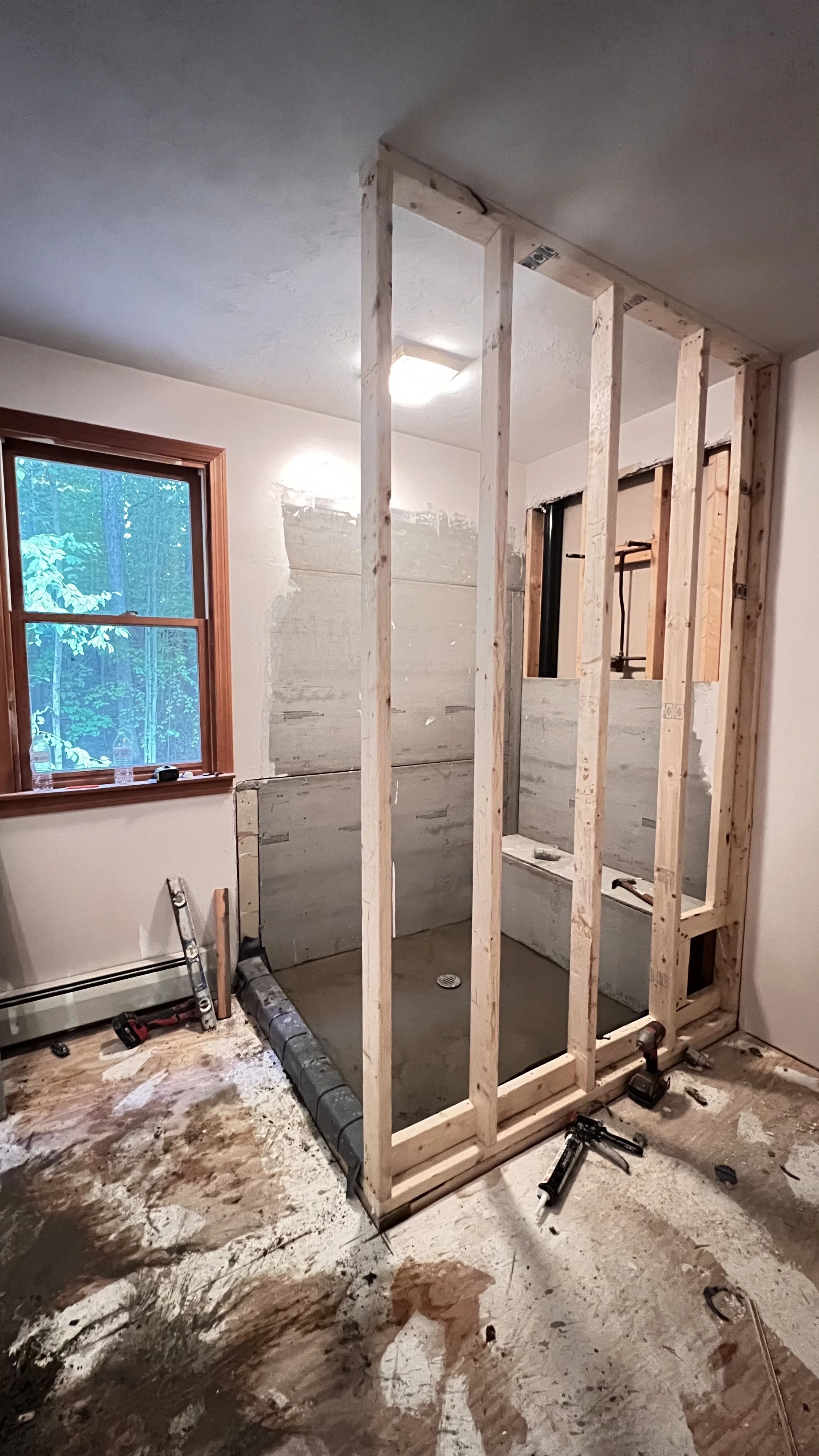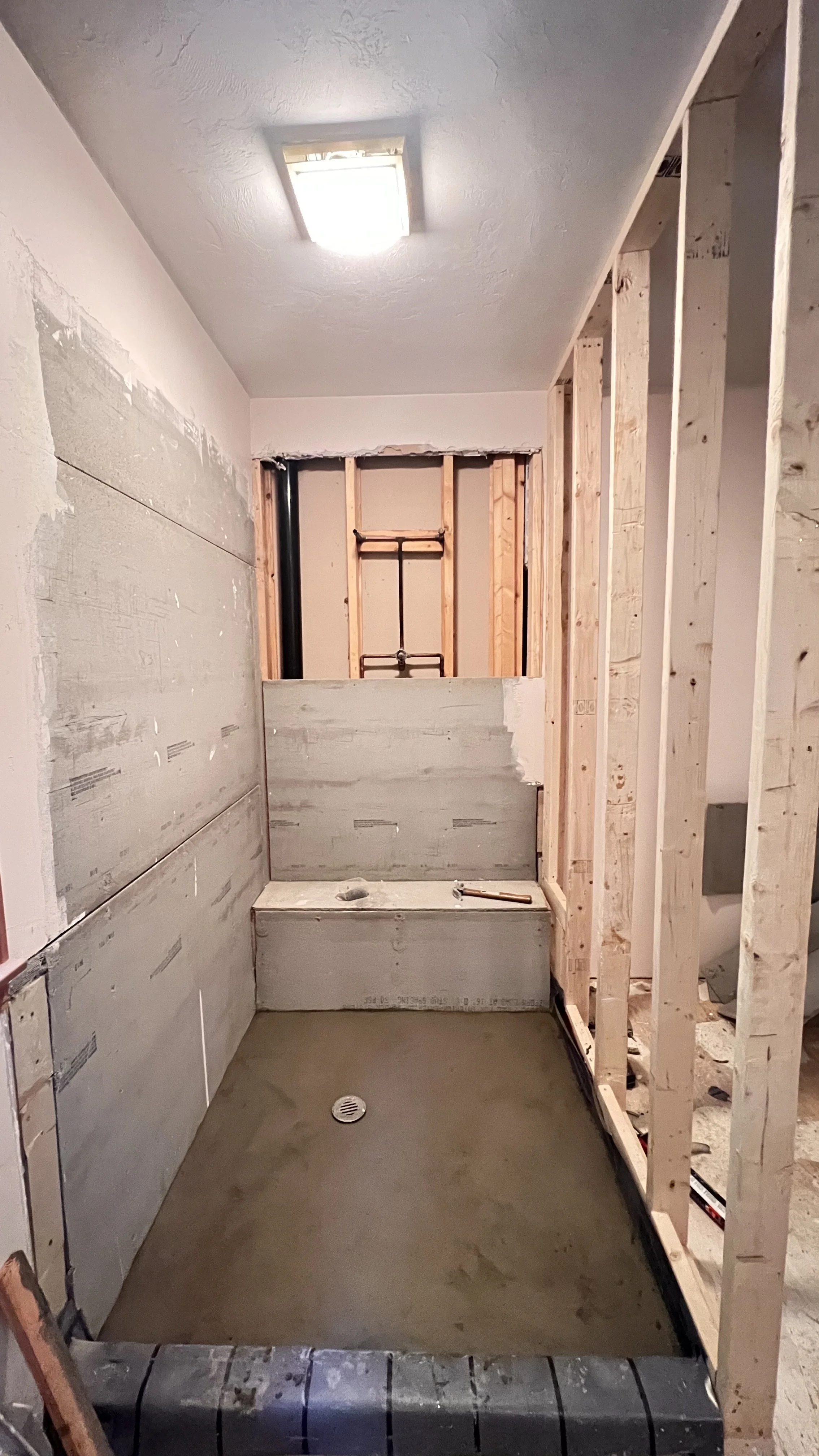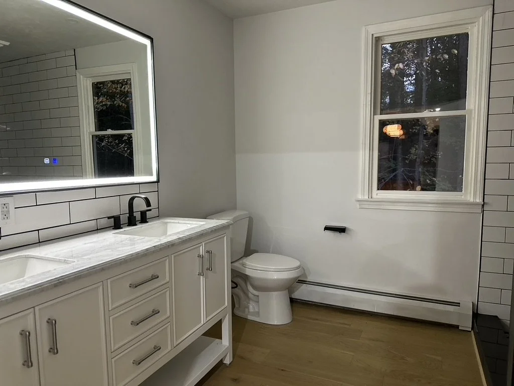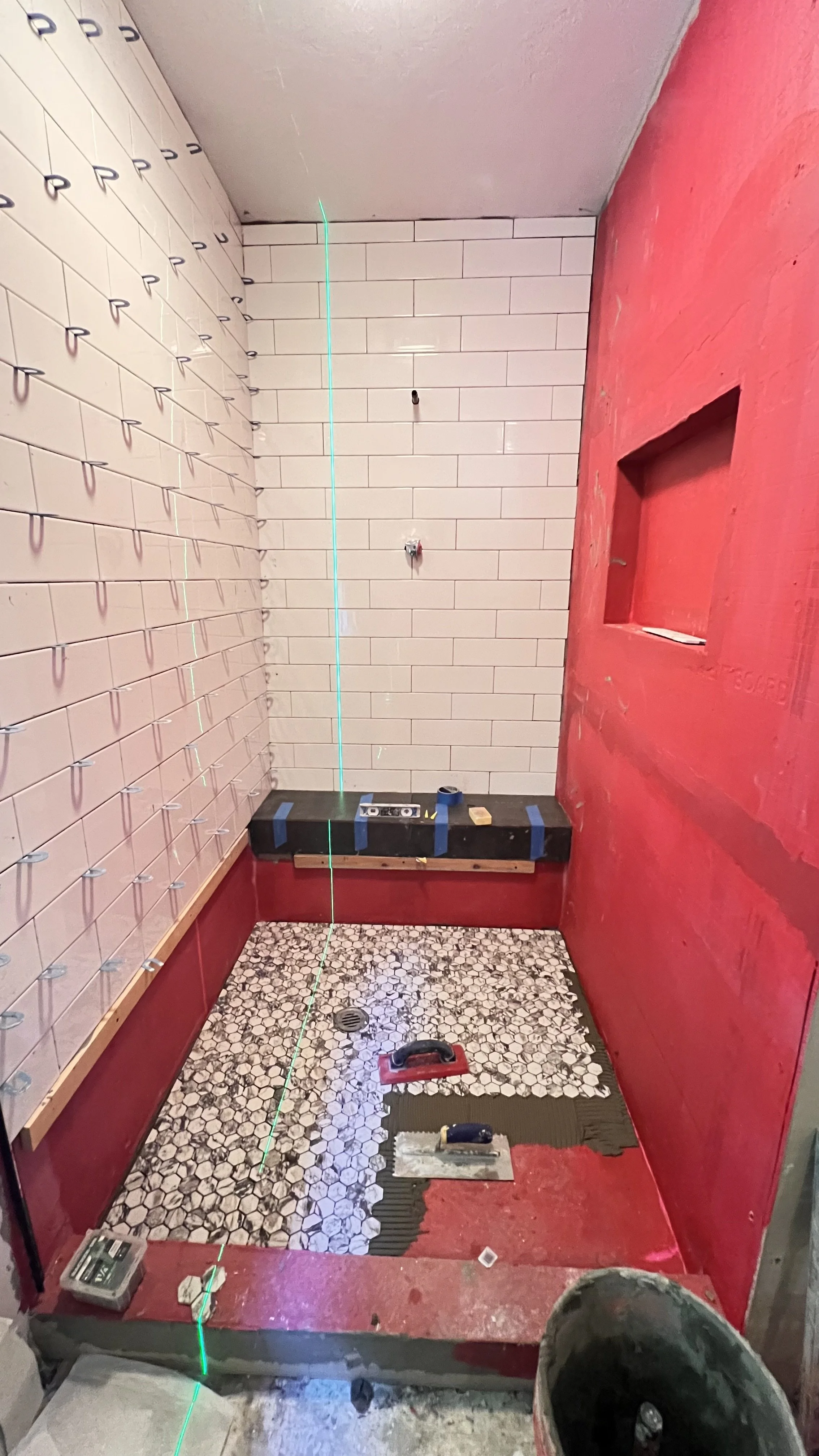 Elegant Modern Farmhouse bathroom design with white tile, black accents, and a sophisticated, balanced aesthetic.