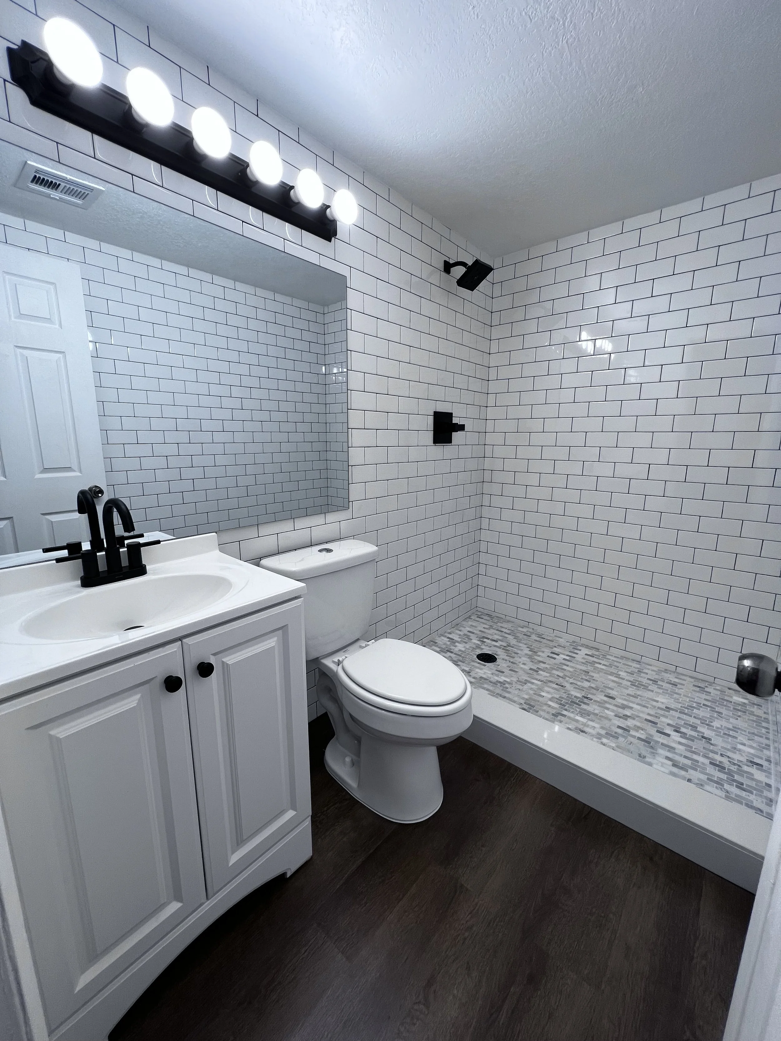 One-day small bathroom refresh, including tile removal, surface prep, and installation of new floor tile for a clean, modern look.